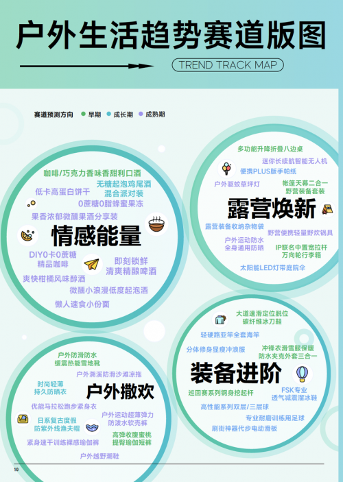 巨量算數(shù) & 算數(shù)電商研究院綜合趨勢賽道評估模型,篩選出了 38 個(gè)戶外生活行業(yè)趨勢賽道,覆蓋運(yùn)動(dòng)用品、戶外用品、箱包、方便食品、酒飲等多板塊,我們認(rèn)為推動(dòng)品類的創(chuàng)新力集中在功能創(chuàng)新、場景創(chuàng)新和情感創(chuàng)新。