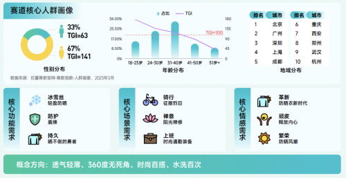 防曬衣賽道解讀:搜索量同比增長 161.4%,遠(yuǎn)高于行業(yè)整體,該賽道上半年搜索量逐漸上升,下半年搜索量逐漸下降,6月份搜索量最高。興趣群體以女性為主,31-40 歲人群占比高,用戶集中在一線和高溫天氣多發(fā)城市。未來,防曬衣可能會(huì)更加注重輕盈防曬、持久等功能,為消費(fèi)者提供更好的防護(hù)和穿著體驗(yàn),并向輕薄、智能等方向發(fā)展。