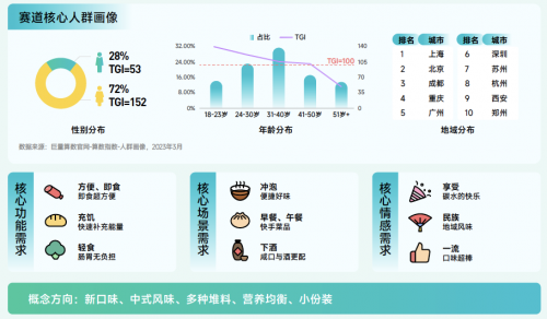 方便食品賽道解讀:2022年3月-2023年4月間搜索量同比增長 829.6%,遠(yuǎn)高于行業(yè)整體,月度趨勢波動(dòng)攀升。女性為主,31-40 歲人群占比高;集中在一二線城市。方便食品由于其便宜、快速和方便,逐漸成為出行必備品。正所謂,方便生活,小包裝,大營養(yǎng)。在戶外出行中,方便食品助你享受更加自由、無拘束的旅程。