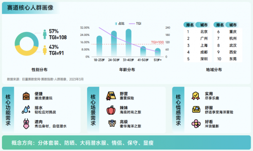 沖浪賽道解讀:2022年搜索量同比增長100.7% 。用戶以男性為主,集中在北上廣一線城市。24-40 歲人群對沖浪潛水更感興趣。相對來說,對于沖浪潛水用戶更注重便捷、排水等功能。未來,隨著技術(shù)的發(fā)展和人們對海洋環(huán)境保護(hù)意識(shí)的增強(qiáng),沖浪運(yùn)動(dòng)將更加注重舒適、安全和環(huán)保,并可能推出更具創(chuàng)新性的裝備,產(chǎn)生新的活動(dòng)形式。
